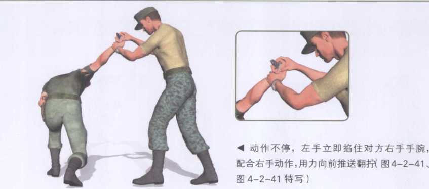 ?然后身体猛然向右拧转右手抓住对方持刀手拳面顺势向右侧翻拧令其产生剧痛(图4-2-40、图4-2-40特写)