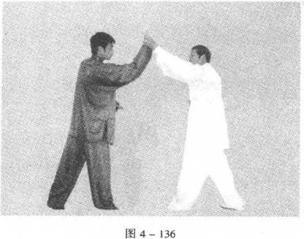 (二)承上式。甲方迅速前进一步使脚进至乙方的右脚后方同时右掌沿乙方右臂肘弯上侧穿至乙方右掌的前下方掌心朝下目视乙方手掌。(图4-137)