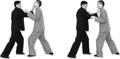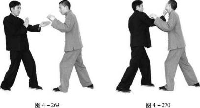 甲方以问手式与乙方对峙时乙方突向前移步并用双手搂按住甲方双肩欲发动膝攻。甲方急速稳定桩马左手成护手防护同时拧转腰髓发出右手抽撞拳上击乙方下颌。乙方遭到攻击并不退却同时上抬双臂挺身发出左膝顶撞甲方腹部或裆部。甲方缩腹避闪乙方膝攻同时攻势不停右手连发抽撞拳攻击乙方下颌乙方被击晃动身体甲方稍下落右拳再勾击乙方下颌部位(图4-269-图4-272)。