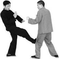 图4-273 图4-274图4-273 图4-274甲方以问手式与乙方对峙时甲方抢先发动攻击以前锋手成抽撞拳打出迫使乙方做出反应乙方缩身上抬双手防护闪避甲方左手攻击。甲方迅速重心前移左腿支撑突起右脚斜踩踏乙方前伸的左腿膝或胫骨部,乙方遭到踢击欲收腿下落手防护。甲方攻势不停随即下落右脚起左脚侧撑踹乙方胸腹部(图4-273?图4-276)。