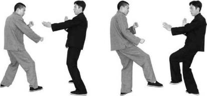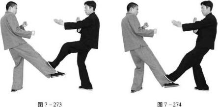 图7-271 图7-272图7-271 图7-272甲方与乙方对峙时甲方以问手式保持防护乙方抢先起右脚欲踢向甲方。甲方迅速反应起左脚踏于乙方的右脚背上随即将乙方右脚踩踏下阻截乙方的起腿(图7-271?图7-274)。