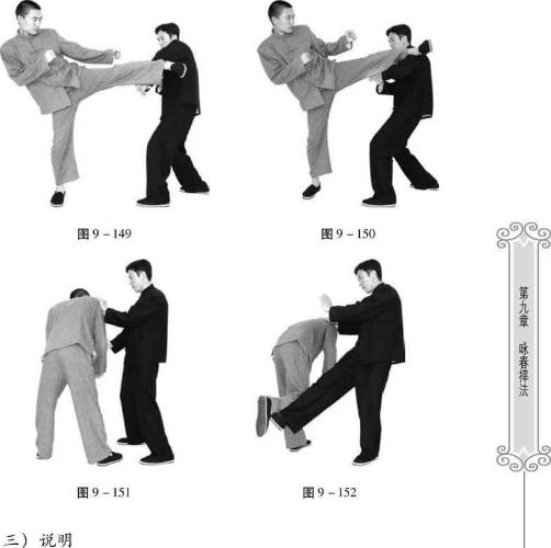 2 压肩勾腿乙方发腿踢空迅速下落收脚甲方迅速前移右脚同时用双手按压乙方右肩臂向右后方发力压带同时以左脚支撑拧转腰懿发右脚向左上方勾踢乙方支撑脚内侧以上下之合力将乙方击摔倒地(图9-150-图9-152)。