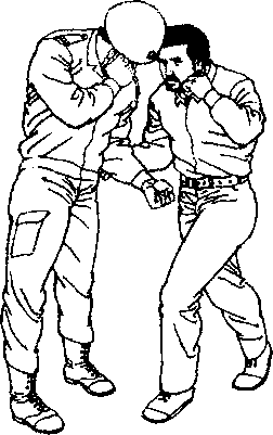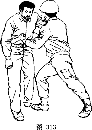 横肘一般与直拳或摆拳相连贯而做。当摆拳或直拳出击后前臂迅速内屈(小于90度)利用腹胯的旋转和背部肌转力一起发力猛击敌人的腮、颈、头、肋部(见图-315)