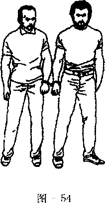 令两犯罪嫌疑人并排站立或跪下警察位于两人中间前面用铐将两人内侧手腕部铐住。这种铐法主要用于押解(见图-54)
