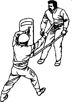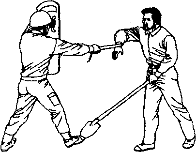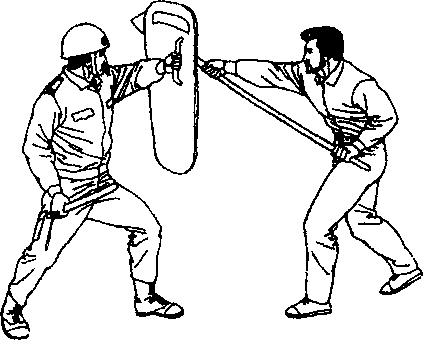 歹徒手持铁掀朝警察上部横扫警察举起盾牌防挡(见图-204)-252-第七章缉捕中的格斗技术图+204左防的同时警察右脚朝前跨步警棍直捅歹徒腹部(见图-205)-205-253-中国警察格斗大全一招制敌如果歹徒持铁锹朝警察小腿铲击警察跳起,左脚下踩铁锹(见图-206),随即挥动警棍打击歹徒右腕力道稍猛一点的话足可打断歹徒的腕骨(见图-207)图-206图-207-254-第七章缉捕中的格斗技术