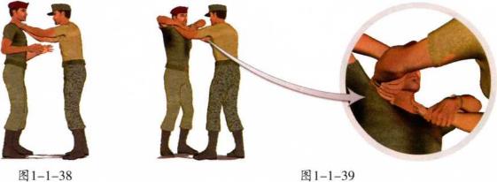 (3)动作不停上体略后仰双臂猛然屈肘下沉双手勾住对方双腕顺势将其由我脖颈处沿我双肩拉向身体两侧。同时右腿抬起向前狠狠挂踢对方裆部腹股沟位置破解对手控制的同时予以重创(图1-1-40)。