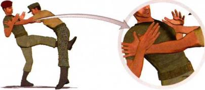★右腿攻击对方的时候双臂要屈肘内扣、夹紧牵制住对方的上肢,避免对方向后撤身。随后的进一步打击可随势而定灵活应用。