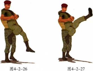 将右腿屈膝提起将右脚蹬踏在对方右大腿之上。同时左腿向前伸展、摆动(图4-2-26、图4-2-27),然后再利用左脚回荡的力量攻击敌人腹股沟迫使其放松对我的搂抱(图4-2-28)。