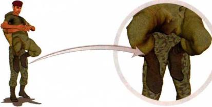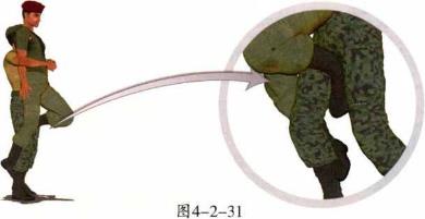 (3)旋即左腿屈膝左脚用力向后回荡以脚后跟为力点撩踢对方腹股沟迫使其放松对我的搂抱(图4-2-31)。