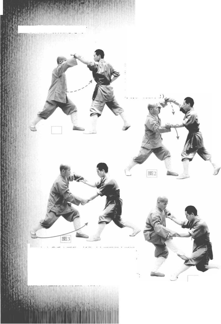 (图1、2(图1、2(1)对方出左拳欲击打我头部我左弓步右臂向上向外格挡并顺势抓握对方左小臂。对方再出右拳击我头部我左臂向上向外格挡并顺势抓握对方右(1)对方出左拳欲击打我头部我左弓步右臂向上向外格挡并顺势抓握对方左小臂。对方再出右拳击我头部我左臂向上向外格挡并顺势抓握对方右吃心脚踢膝关节吃心脚踢膝关节小臂。小臂。(2)我重心下移抓住对方两臂猛力下压,使他重心不稳同时让其膝部暴露于我腿前。(图3)
