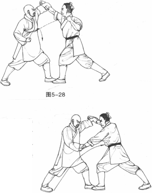 2 敌方迅疾出左拳击打我方心口部。我方迅疾用右手抓住来拳手腕向下按压阻截敌拳攻击。(图5-29)