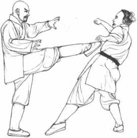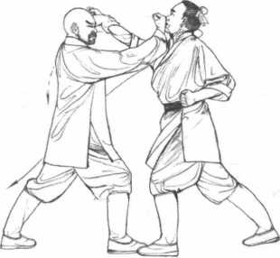 3 动作不停我方迅疾将敌方两臂向外分开随即撒手右腿提膝入怀脚尖向前弹踢敌方心口部位致敌重创。(图5-30)