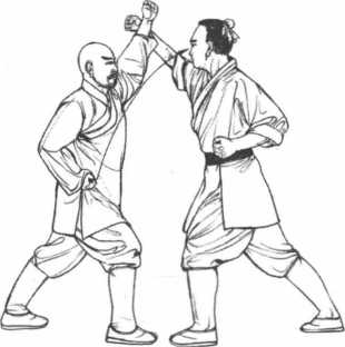图5-31图5-311敌方左进步右拳前抡劈打我方头顶。我方迅疾将左脚后撤一步左拳上举用左前臂格挡敌方右前臂。(图5-31)