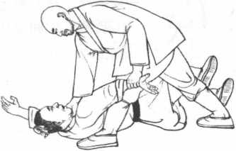 3 动作不停我方左手抓住敌方右腕向左下旋拧同时右拳变掌卡住敌方咽喉向左后旋压使敌仰身倒地。
