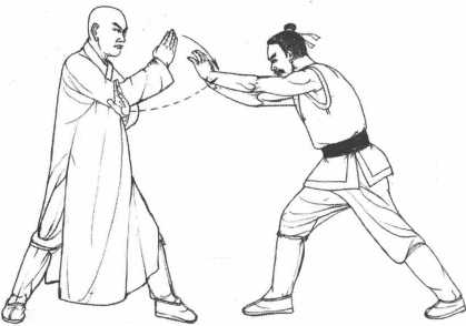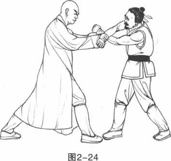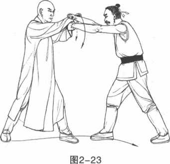1 敌方右进步双掌向我方面部扑击。我方迅疾后滑步退身避过敌掌锋芒。(图2-22)2 随即我方两手前伸交叉向前左手在下抓敌左腕,右手在上抓敌右腕。(图2-23)3 动作不停我方迅疾右脚跨上一步踏入敌方中门同时两手左右分抖发力右手下压左手上抬将敌两臂绞翻制住。(图2-24)