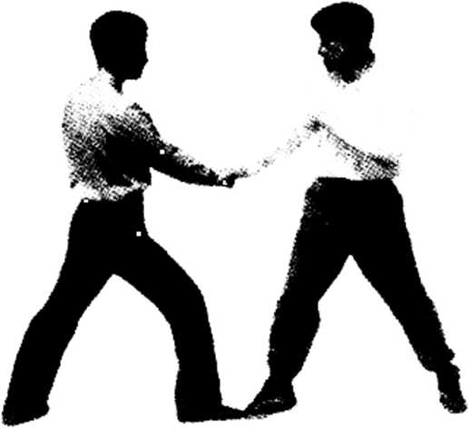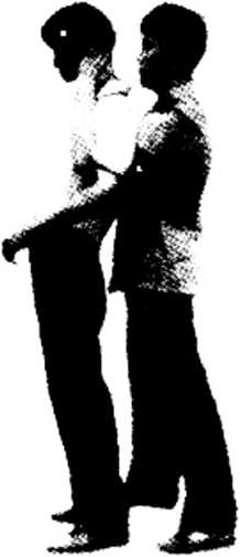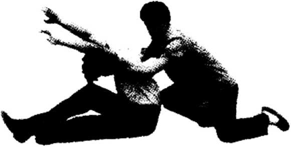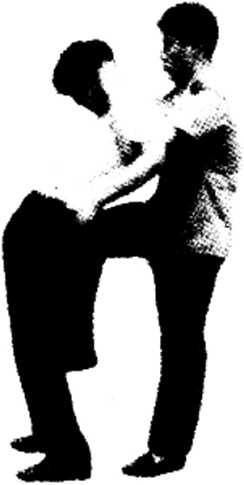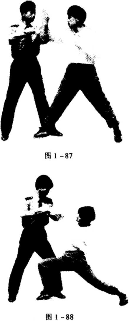 动作由背后突然接近对方双手由其腋下向前插并用力屈肘上挑两臂外撑两手按住对方头部后侧向前下方用力压同时用右膝猛顶其臀部将其摔倒拿住。身体要紧紧贴住对方背部使其难以活动。目视对方观察其动作变化,(图1-899091)