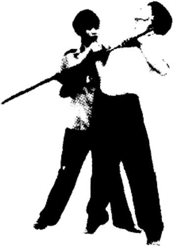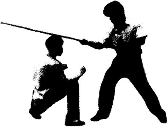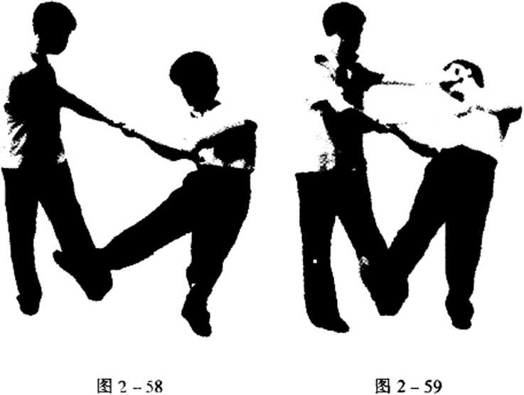 动作对方双手持棍向我反背横扫时我迅速下蹲屈身闪过当棍扫过头顶后抓住时机起身并用双手按抓棍身随即用左脚勾扫其前腿同时用左拳反背横击其头面部。(图2—57,58,59)