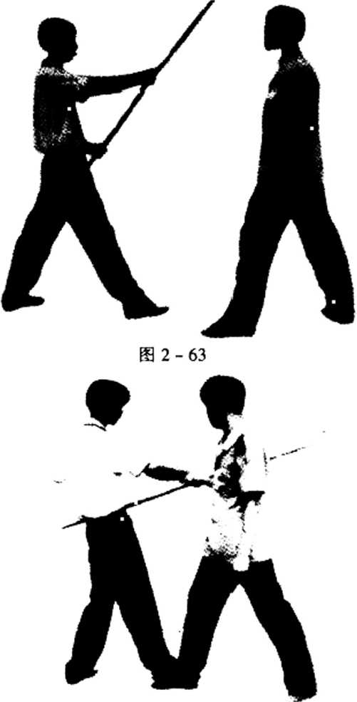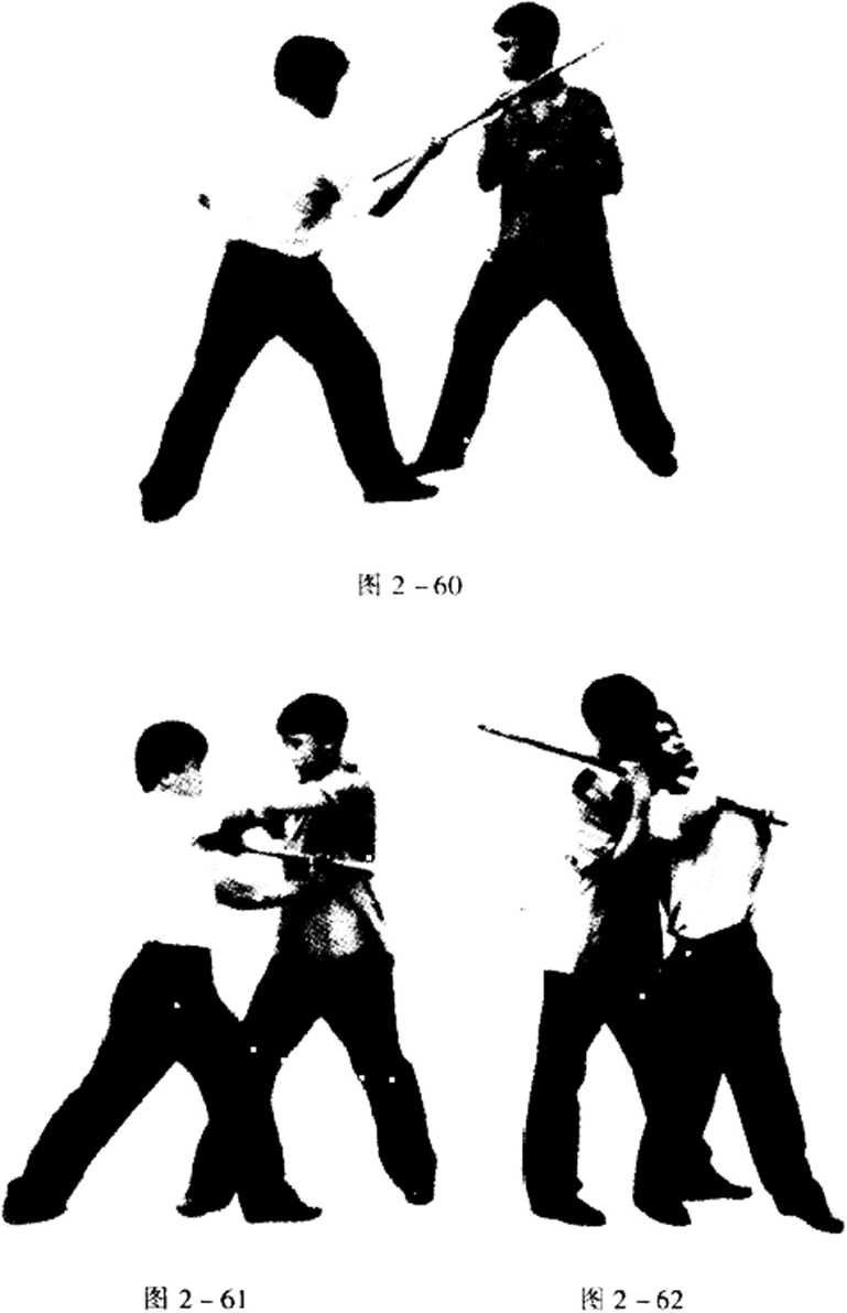 动作对方用棍向我捅击时我迅速向右侧躲闪用右手抓住堤的前端并向上向前推棍左手顺势抓住棍的中端向后拉迫使棍竖起随即上右步向左转身身体紧贴其背部左侧,用棍中段套住其颈部双手用力向后拉将其颈锁住使其失去抵抗能力。(图2—60、61、62)