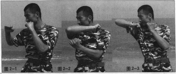 右肘须放松、敏捷地挥向头部左侧(图1-3)