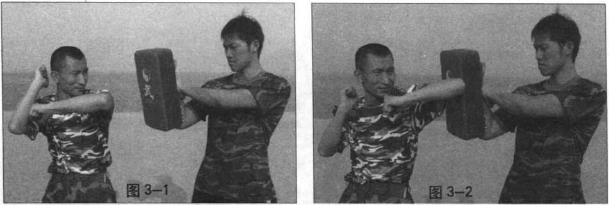 功力练习可以通过击打同伴手中的拳靶来训练后撞肘的准确性、杀伤力及攻击速度(图3-1、2)也可以通过击打沙袋来训练后撞肘的深层穿透性与破坏力。