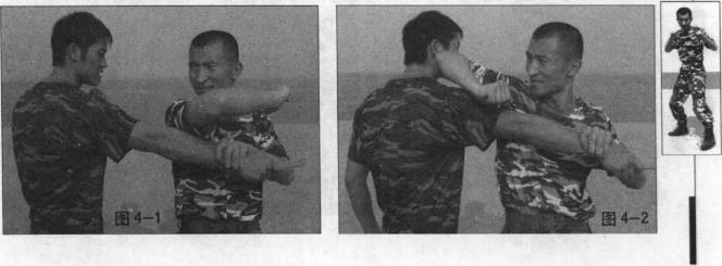 我先用左手抓牢敌方攻来的右臂同时将右肘向左上方挥起蓄力(图4-1)