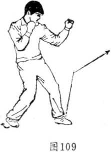 (1)原地侧踹腿左势站立重心后移左腿提膝脚尖勾起右脚支撑以右脚前脚掌为轴右侧转体送懿同时左脚向左侧猛力踹出力达脚掌左拳经体前后撩右手护下颌目视左脚(如图109110)