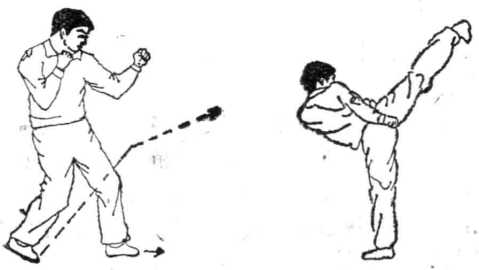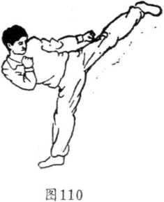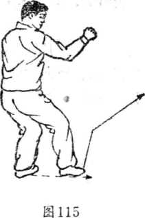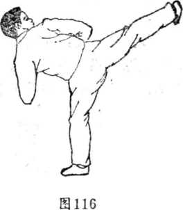 (4) 垫步侧踹腿右格斗式右脚蹬地右腿提膝勾脚左脚向前垫一步至右脚原来位置或稍前同时右腿向前猛力踹出右拳下裕后拨左拳护下颌(如图115、116)。