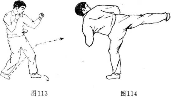 (3)转身侧踹腿左格斗式左脚经右腿前向右前上步、脚尖内扣、右腿提膝向右转体送髓向右后踹出右拳随踹出腿后拨左手护下颌目视右脚方向(如图113、114)