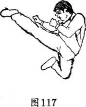屈膝提起身体向左转动挺腹展髓向前踹出右脚右手下格左手置下颌左侧目视右腿(如图117)