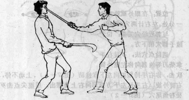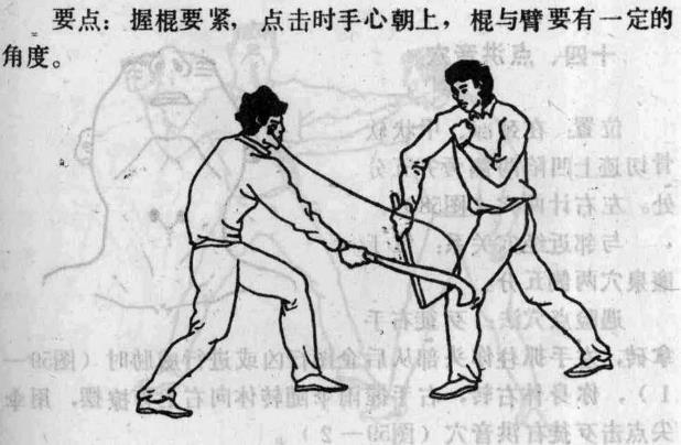 遇险点穴法歹徒右手拿柴刀等凶器向你左腿外侧砍击你右手持短棍向左下方挂防(图57-1)上动不停右臂外旋七右手从左下方弧形向右上方摆出用棍尖点击歹徒右鱼尾穴(图57—2) 二