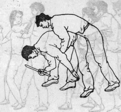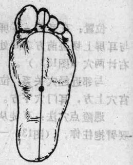位置在足掌的第二趾尖端至足跟联线之中点处。左右计两穴(图135)。 与邻近经穴关系位于涌泉穴后一寸凹陷中。 、遇险点穴法歹徒从后抱住你腰部你上体前俯左手后伸(图136—1),上动术停左手从下向前上方抓扳歹徒右腿同时重心降低用臀部坐压其膝关节处右手持短棍下戳用棍的底端点击歹徒右足心穴(图136-2)。要点扳其腿时尽量把鞋脱掉点击效果更佳。4 ?