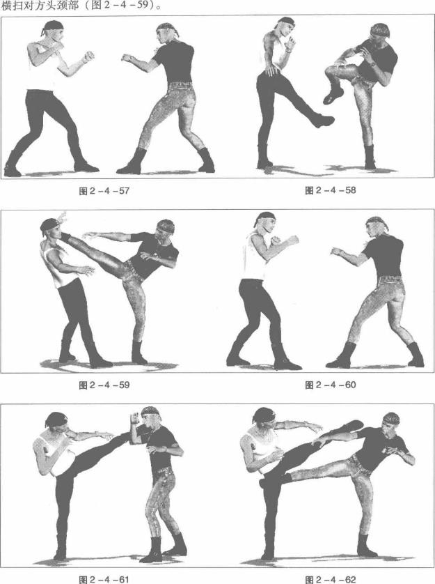 4 双方在街头对峙伺机而动(图2-4-60)对方突然旋转身体以左腿横扫我上盘攻势凌厉我迅速抬起右臂进行格挡(图2-4-61)在化解掉对手凶悍腿攻的瞬间我身体猝然向左拧转右脚随势抬起借助腰雕旋转之力右腿快速向左横扫对方支撑身体平衡的右腿后侧破坏其身体重心稳定可将其扫踢跌倒(图2-4-62)。