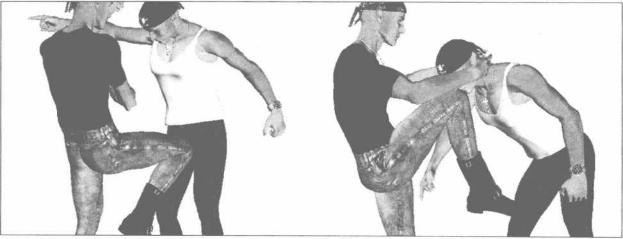 正膝攻击也叫做前膝攻击主要是以膝盖为力点屈膝向前上方发动的攻击多用于攻击对手的裆腹部(图2-5-1),以及面部(图2-5-2)。正膝攻击在实战中是一种近身缠斗时常用的腿法而且可以左右连续出击威力更加巨大往往可以彻底击溃对手。在具体运用时往往用双手先行控制住对手的上盘缩短交手距离后使打击更加行之有效。上下肢协同动作可使杀伤力倍增。