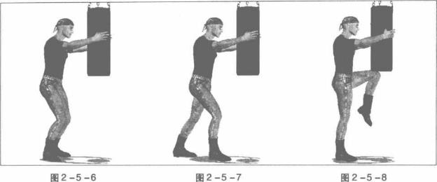 在身体左侧前方较近距离悬挂一个沙包首先按左前式格斗防御姿势站立全身放松目视沙包身体重心落在两腿上(图2-5-3)攻击时身体先向左转面对沙包,重心向前移动同时伸出双手向前抱住沙包蓄势待发(图2-5-4)随即身体重心继续向前过渡左腿蹬直微屈膝独立支撑右脚蹬地离开地面右腿屈膝随势向前上方攻出以膝盖为力点向前上方顶撞沙包底部膝盖略高于胯部目视前方撞击瞬间配合呼气(图2-5-5)右膝攻击结束后右腿肌肉与各关节迅速放松右脚自然向向下落地与左脚并拢双腿微屈双手揽住沙包不放(图2-5-6)紧接着再进行右膝盖攻击出腿时左腿先向后撤退半步(图2-5-7)随即身体重心继续向前过渡右腿蹬直微屈膝独立支撑左脚蹬地离开地面左腿屈膝随势向前上方攻出以膝盖为力点向前上方顶撞沙包底部膝盖略高于胯部目视前方撞击瞬间配合呼气(图2-5-8)攻击动作结束后左脚自然向下落地与右脚并拢双腿微屈双手揽住沙包不放。