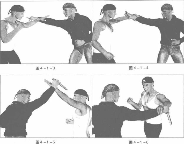 挡抓是针对对手持刀手臂前段进行格挡并抓拿的手法在改变或者阻截其攻击路线的同时进行控制。主要用于防御摆刺(图4-1-3、图4-1-4)和劈刺(图4-1-5、图4-1-6)