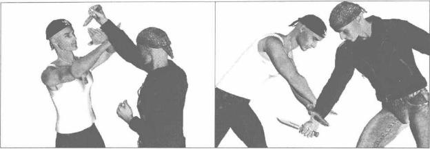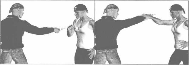 捋抓是在对手攻击来势凶猛时采用的防御技法前提是迅速闪身避过刀锋然后用手由对方持刀手臂外侧进行刁抓的方法抓住其手腕后要用力翻拧。主要用于防御直刺(图4一1一7、图4一1-8)