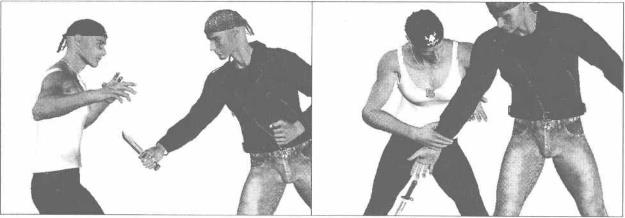 在面对短刀攻击时我们除了及时躲避刀锋之外还要根据对手攻击方式的不同特点使用不同的手法进行最基本的防御。