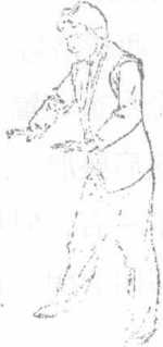 身体直立,目视远方双腿略曲两臂自然平展松肩撑肘,手指前伸抽胯出腿左腿向左旋转约45度着地。右腿同左腿动作一样轮换动作双手掌似按两个大气球随身缓缓滚动,随机前进(图4-10)
