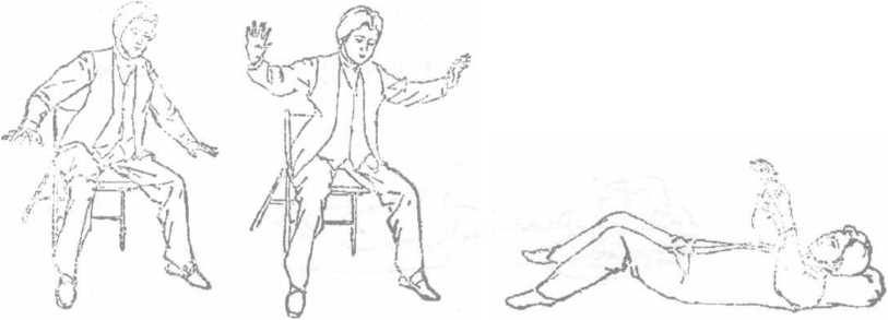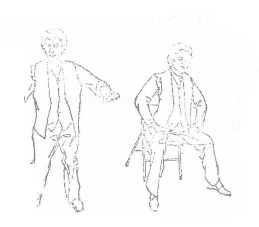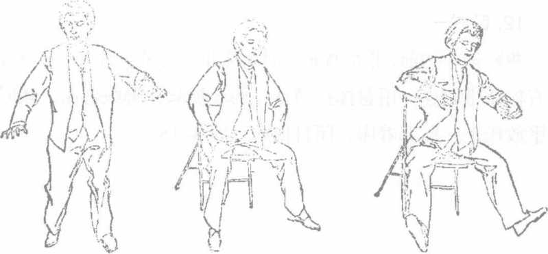 身坐椅边、两臂左右分开自然抬起高不过眉十指分开,似夹非夹,似推物状闭目养神意贯全身两腿分开萌两脚平放、略比肩宽两臂累时可白然轻放腿上(图4-14),