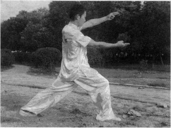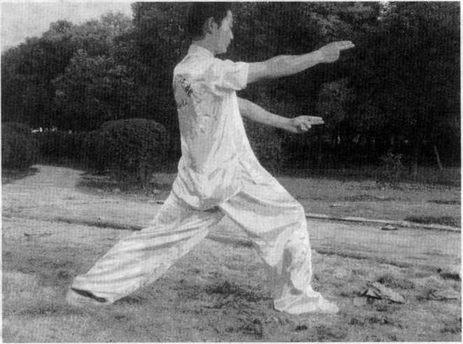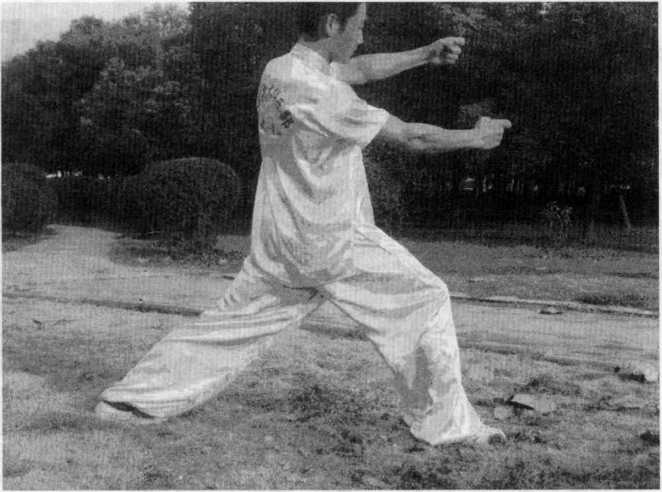 右腿向前上一弓步同时出双手,左手横掌在上右手空心拳在下向敌喉部人迎穴和胸部巨阙穴击打。(图5-7)(图5-7)(四)左右点击保持弓步,同时出双手剑指掌,左手掌心向下,右手掌心向上左手由上向下向对方腹部关元穴点击右手由下向上向右面对方面部印堂穴点击。(图5-8)然后右腿向前上一弓步同时出双手剑指掌左手向上击人中穴,右手向右面对方腹部中院穴击点。(图5-9)(图5-9)