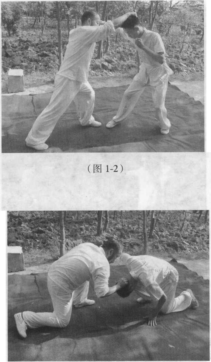 动作1 敌我反自由站立。(图1-1)(图1-1)2 敌右拳打来,我快速进攻,左手架住对方的手同时右手抓住对方头发。(图1-2)3 双手同时向下猛拉让敌前倒。(图1-3)要领抓敌头发向下拉压时,动作要快且连贯,桩身下沉,重心下移以助其力。得手时可用双手同时下拉也可直接用单手。