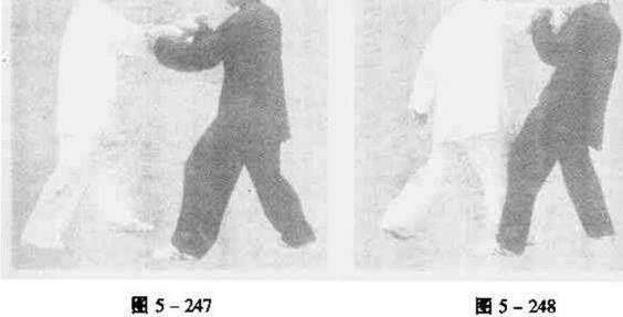 用法1甲乙相对站立。甲提左脚向前上步用右手向前按乙胸部乙提左脚向前上步抬起右手棚接甲右手腕随之抬认式太极4体是全书1二图5-246起左手向前扶按在甲右肘外上侧两手同时向右捋出甲顺乙势提起右脚向前上步接着右手逆缠用右肘向乙胸部打出使乙向后跌出(图5-247、5-248)用法2乙在甲背后提起右脚向前上步随之左手握拳向甲击出甲身体左转同时左手握拳由下向上向外隔开。(图5-249)