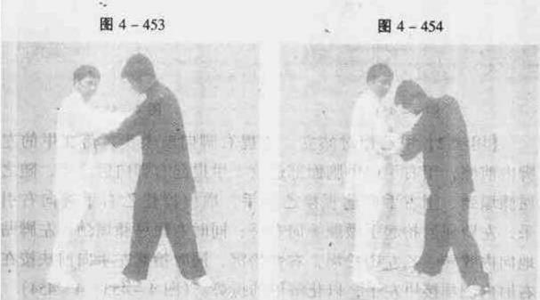 用法2甲乙相对站立乙提右脚向前上步落在甲的左脚内前侧用右手向甲胸面部进攻。甲提起右脚向后撤步随之屈膝塌劲用右手向前棚接乙右手顺缠握住乙右手腕向右引采左臂屈肘抬起手做购缠向右捋同时右腿弓膝塌劲左脚贴地向内收转。乙左腿松塌右臂松沉同时抬起左手向前扶按在右肘内侧棚接甲左手以化解甲的捋势(图4-453、4-454)