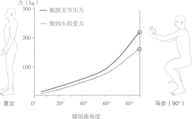 在蹲马步时股四头肌受力可达体重的25倍并长期处于疲劳状态导致肌肉僵化。麒股关节受力可达体重的3倍极易造成关节紊乱和劳损