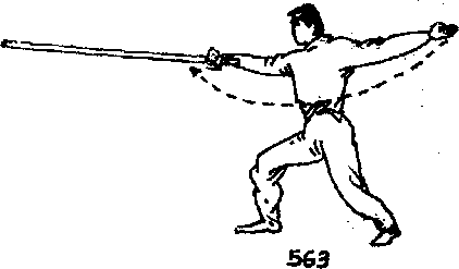 身体上起右腿蹬直。右腿屈膝成左弓步同时左掌随身体上起向左上方摆动屈腕亮掌。目随视左掌上摆。当屈腕亮掌时转视右前方(图569)。