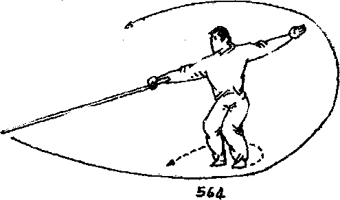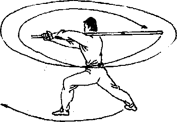 体右后转右脚向后绕撤步成左弓步同时左手离棍伸于左侧随转体平摆右手握棍,使棍梢随转体向右平抡两周当右手绕至胸前时左手伸向腹前准备接握棍。目视棍梢(图567)。