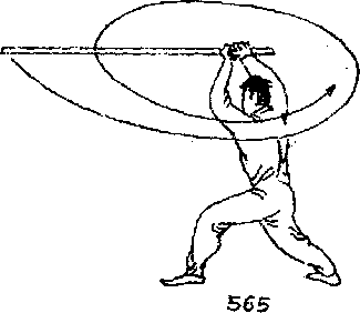 使棍梢继续向左平抡一周半于左肩上背棍。目视右前方图566)