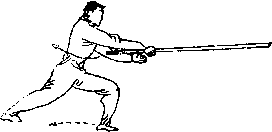 左脚向前落地脚尖外摆右脚向左脚内侧上步两腿屈膝半蹲左转体同时右手握棍°使棍梢由左向后、向右,向前下方抡扫左掌恻举随身平摆目视棍梢(圈