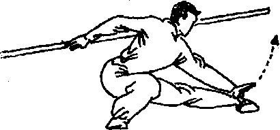 身体向右转成左仆步。同时右手将棍梢从下续经右腿外侧向后、向上绕行棍身背于背后同时左掌向下经左腿内侧向左脚上方直臂穿出目视左掌(图568)。