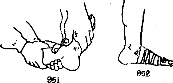 此法可采用踝关节中拧压断踝,肩扛断踝二招也可以使跖趾关节脱位或与敌方靠近时用各种方式用脚跟猛力向下蹬踹敌方同侧脚面也可造成脱位。(二)跖趾关节上骨复位法关节及跖趾关节复位法。一助手握小腿下段一助手握足趾两人作对抗牵引术者用拇指推按食、中指提托使脱位关节复位。复位后用硬纸壳夹好再用绷带缠绕固定(图951、952)